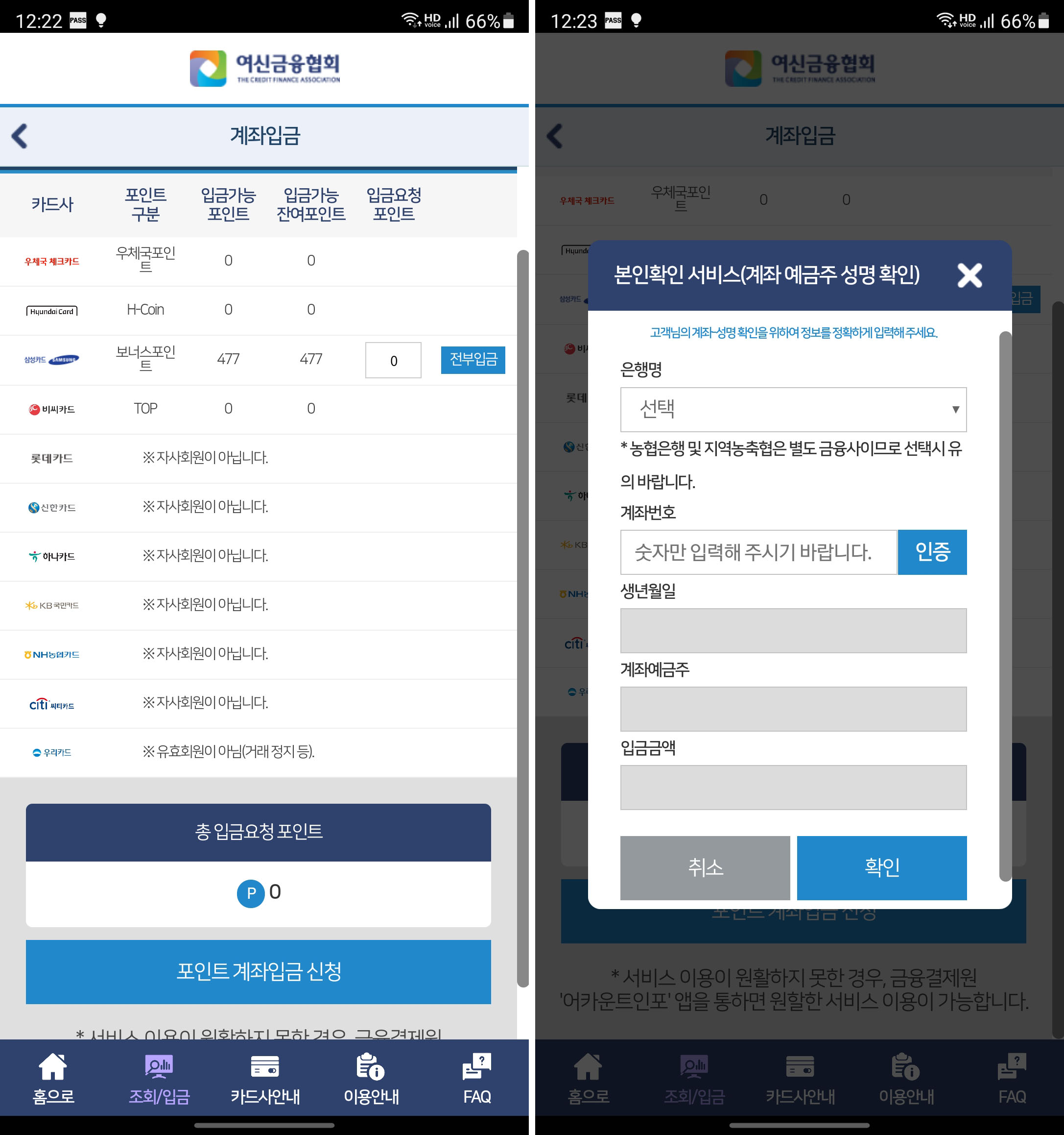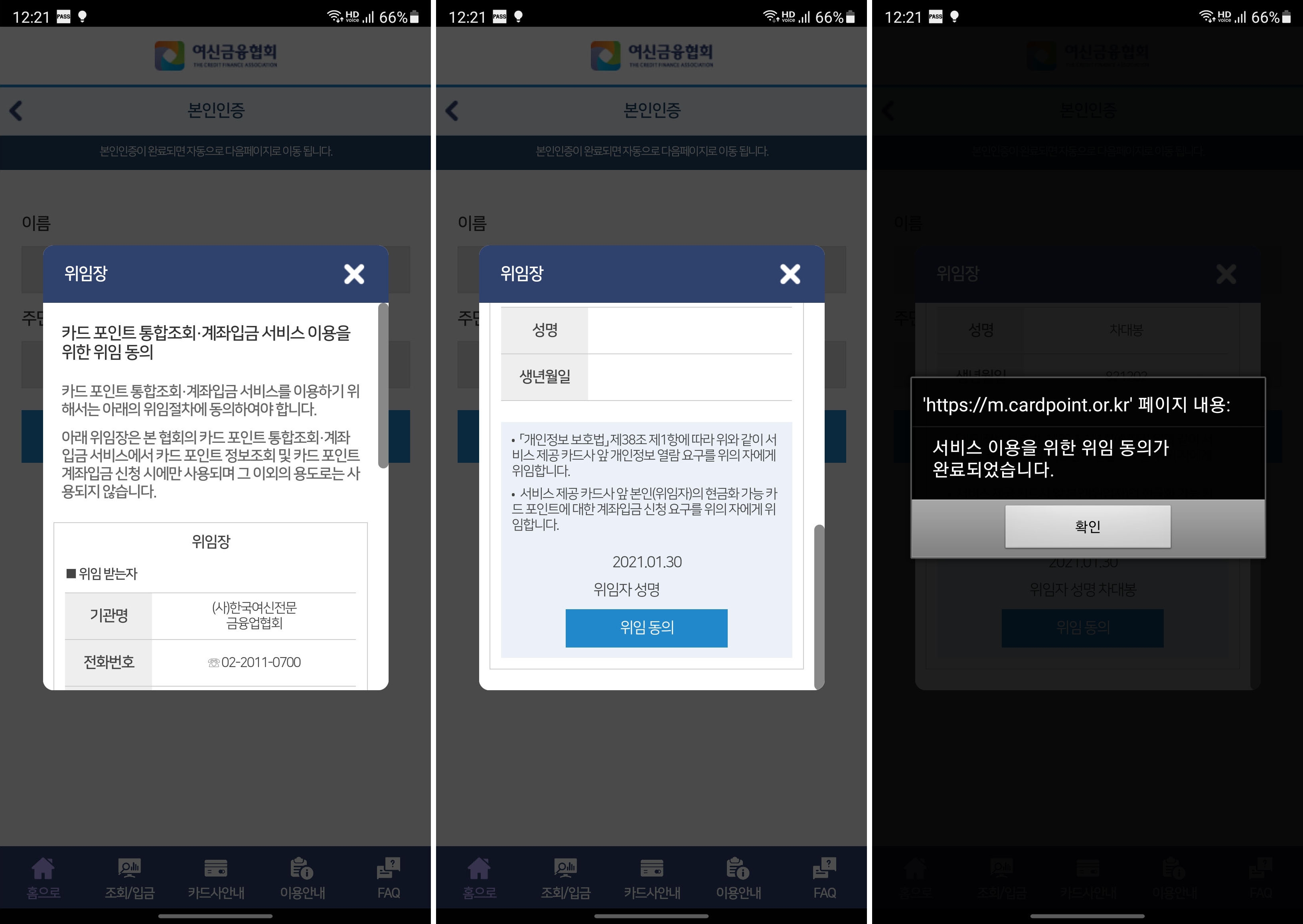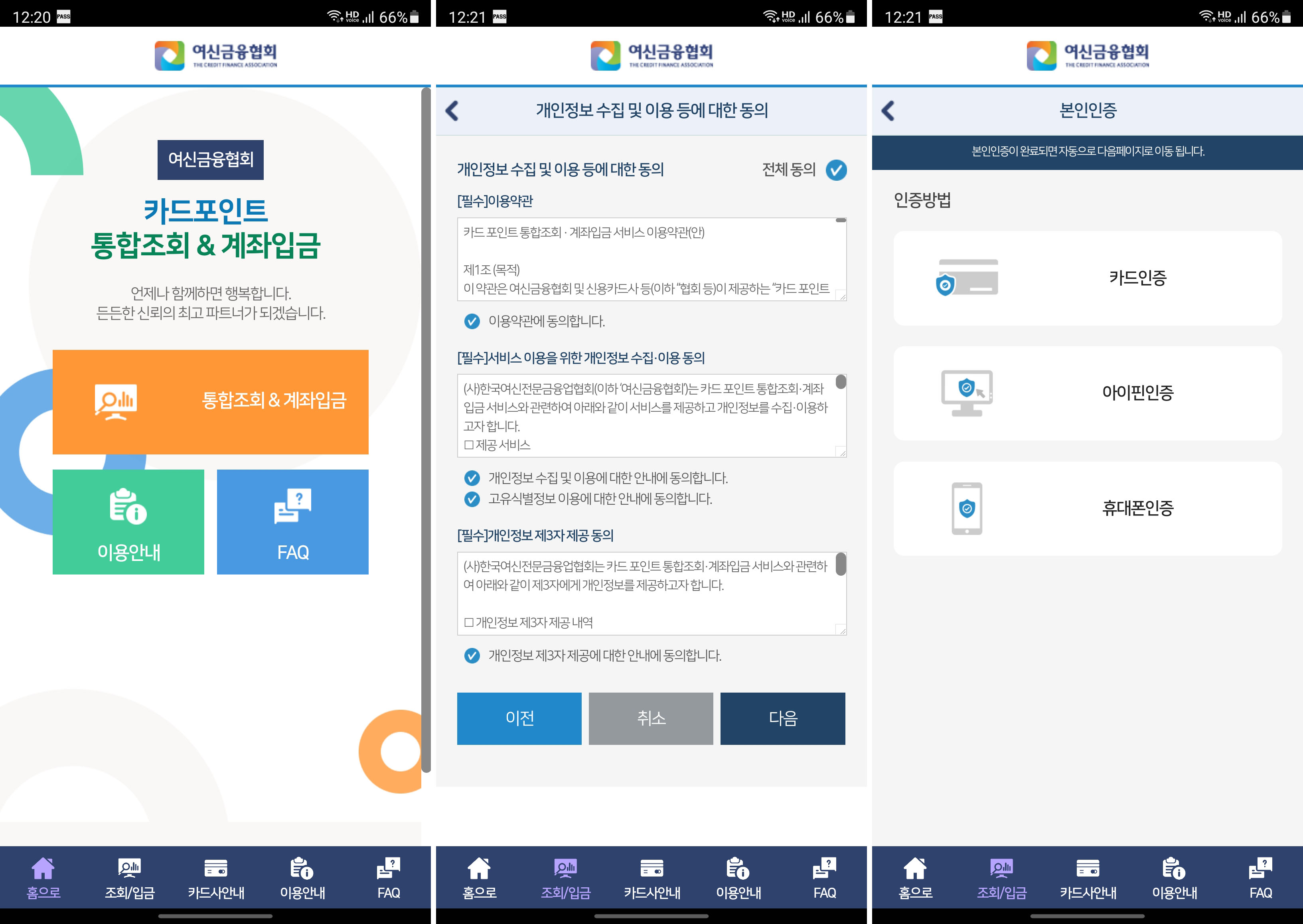 카드포인트조회 앱을 설치하면 화면에 통합조회 & 계좌 입금버튼이 나옵니다. 이버튼을 클릭하면, 개인 정보 수집 및 이용 등에 대한 전체동의 체크한 후 확인. 본인인증을 해야 합니다. 본인 인증은 카드인증,아이핀인증, 휴대폰인증이 있습니다. 본인이 편한 방법으로 인증을 하면 됩니다.