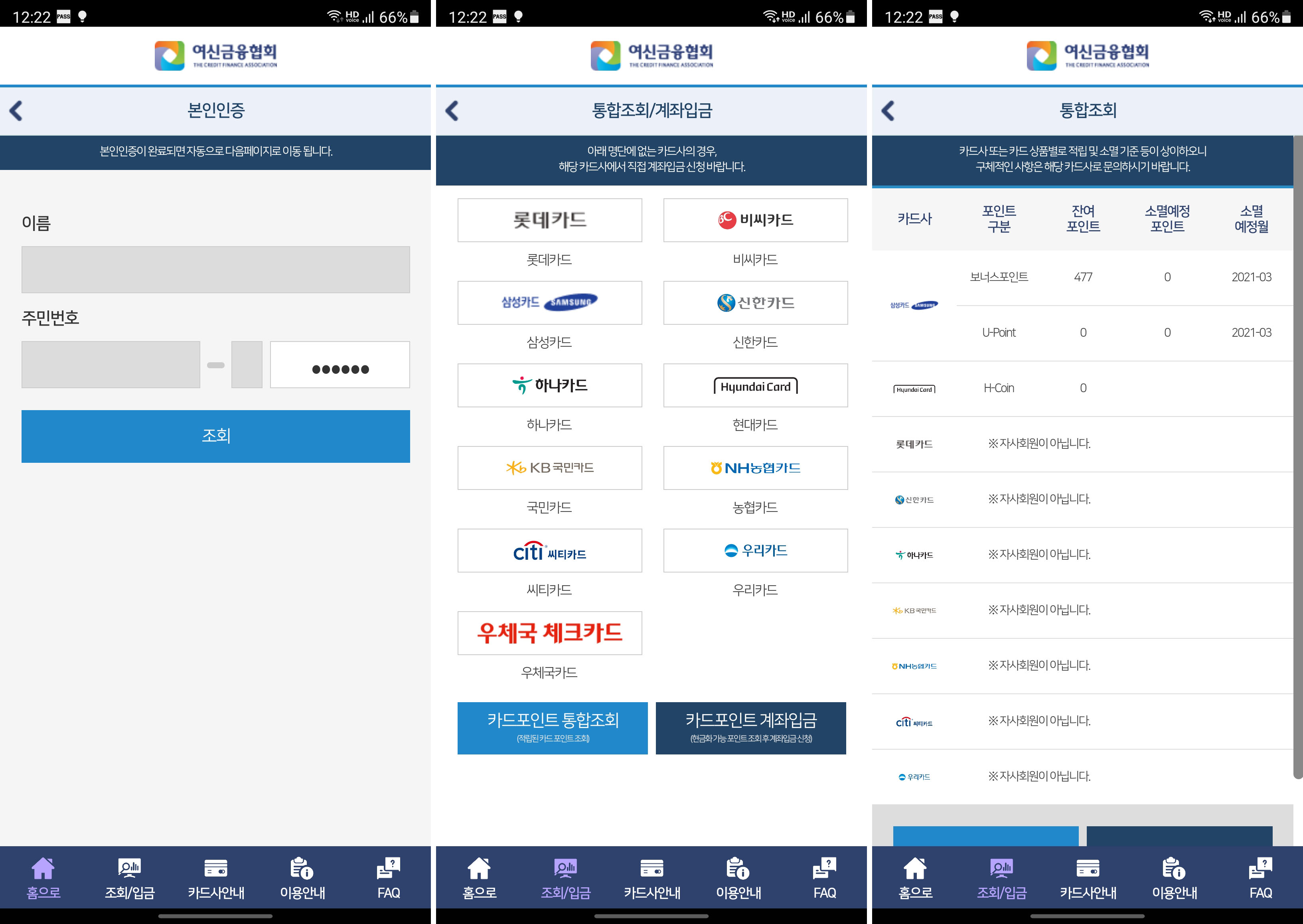 서비스 이용 대상은 외국인을 포함한 신용카드사 등의 개인 회원만 이용할 수 있으며, 법인회원(공용)은 이용할 수 없습니다. 카드 포인트 통합조회 서비스는 홈페이지 또는 휴대폰 앱을 통해서 이용할 수 있으며, 사용을 위해선 본인 인증이 필요합니다. 휴대폰 앱을 통해서 사용 중인 카드들의 포인트를 한 번에 조회하는 방법을 알아보겠습니다.